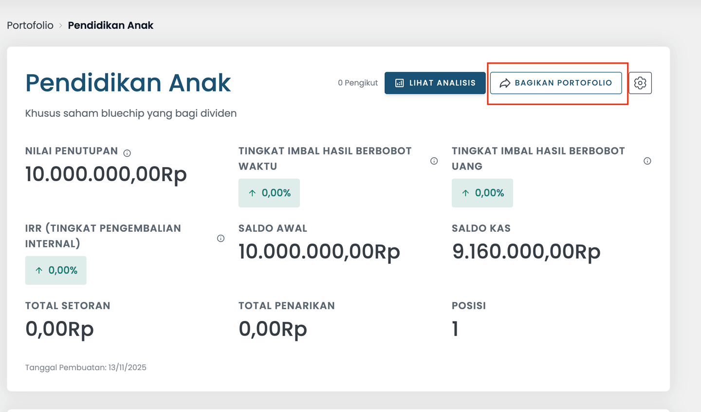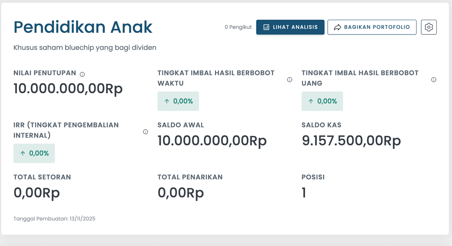 Setelah semua kolom terisi, klik "Buat Portofolio". Portofolio Anda akan langsung aktif dengan nilai awal yang sudah Anda masukkan. Namun, seluruh indikator seperti keuntungan, setoran, dan penarikan masih bernilai nol.