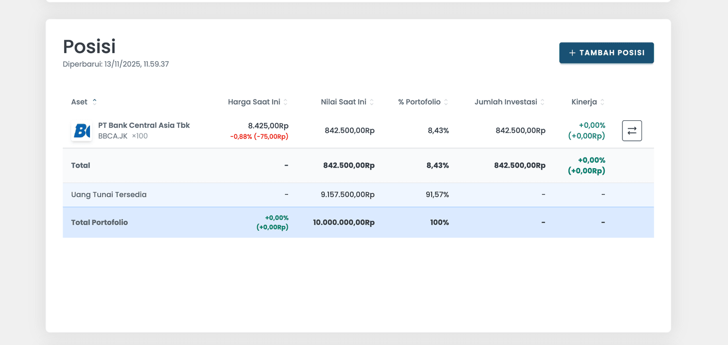 Selanjutnya, untuk mulai menyusun portofolio, Anda bisa langsung mencoba membeli saham atau ETF. Caranya, pada tab "Posisi" klik "Tambah Posisi" dan cari aset yang ingin Anda beli, misalnya Bank Central Asia Tbk (BBCA).