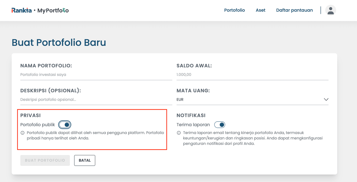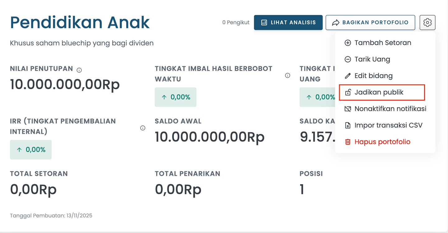 ⚠️ Jika mengubah portofolio menjadi publik, semua orang yang memiliki tautan bisa melihatnya. Namun, hanya Anda yang dapat mengedit atau melakukan transaksi di dalamnya.