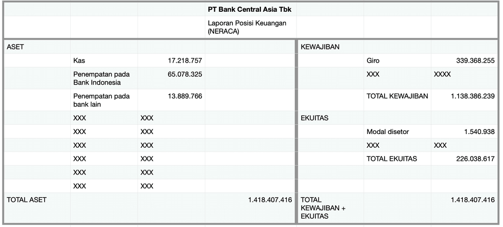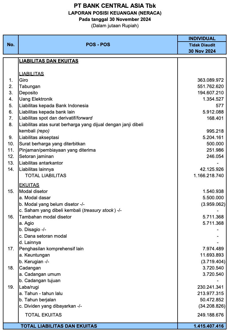 Berikut merupakan contoh neraca keuangan dari perusahaan Bank Central Asia (BBCA) pada bulan November 2024: