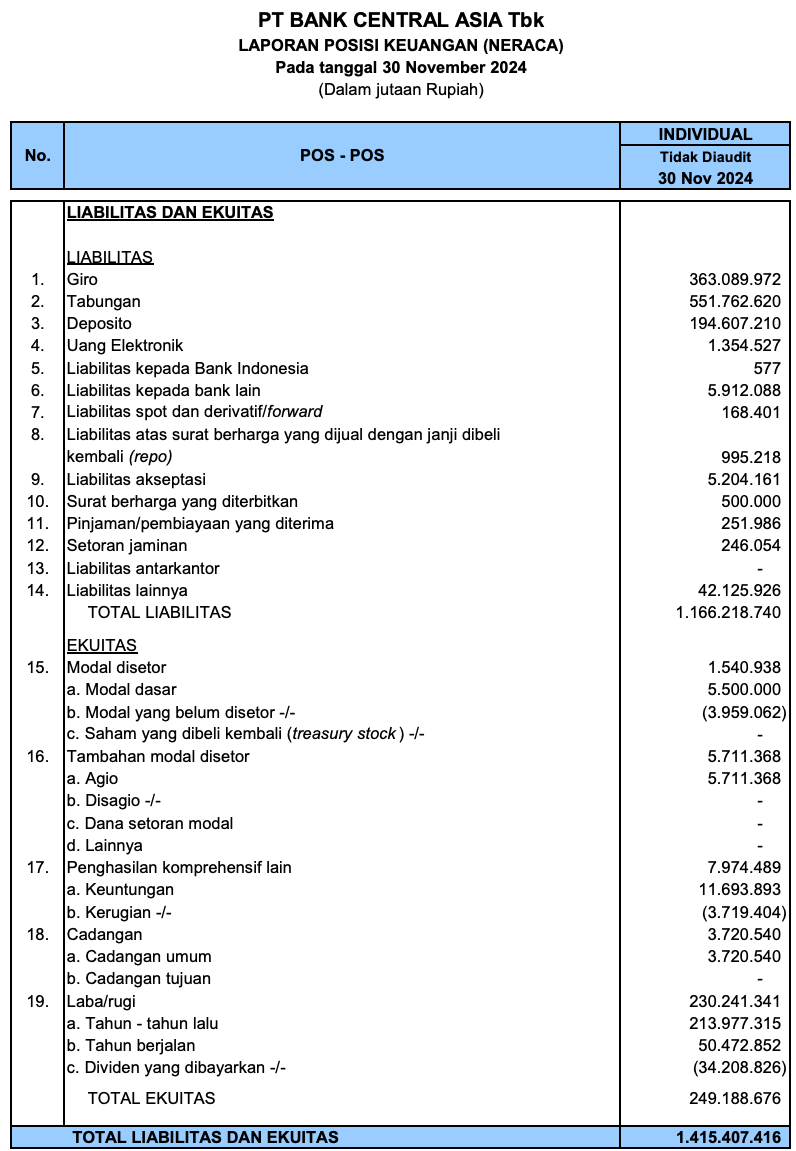 Berikut merupakan contoh neraca keuangan dari perusahaan Bank Central Asia (BBCA) pada bulan November 2024:
