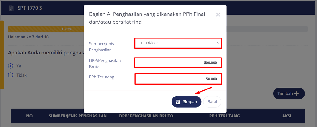 3. Klik Tambah, jika sudah, kini bagian sumber jenis penghasilan ganti menjadi dividen.