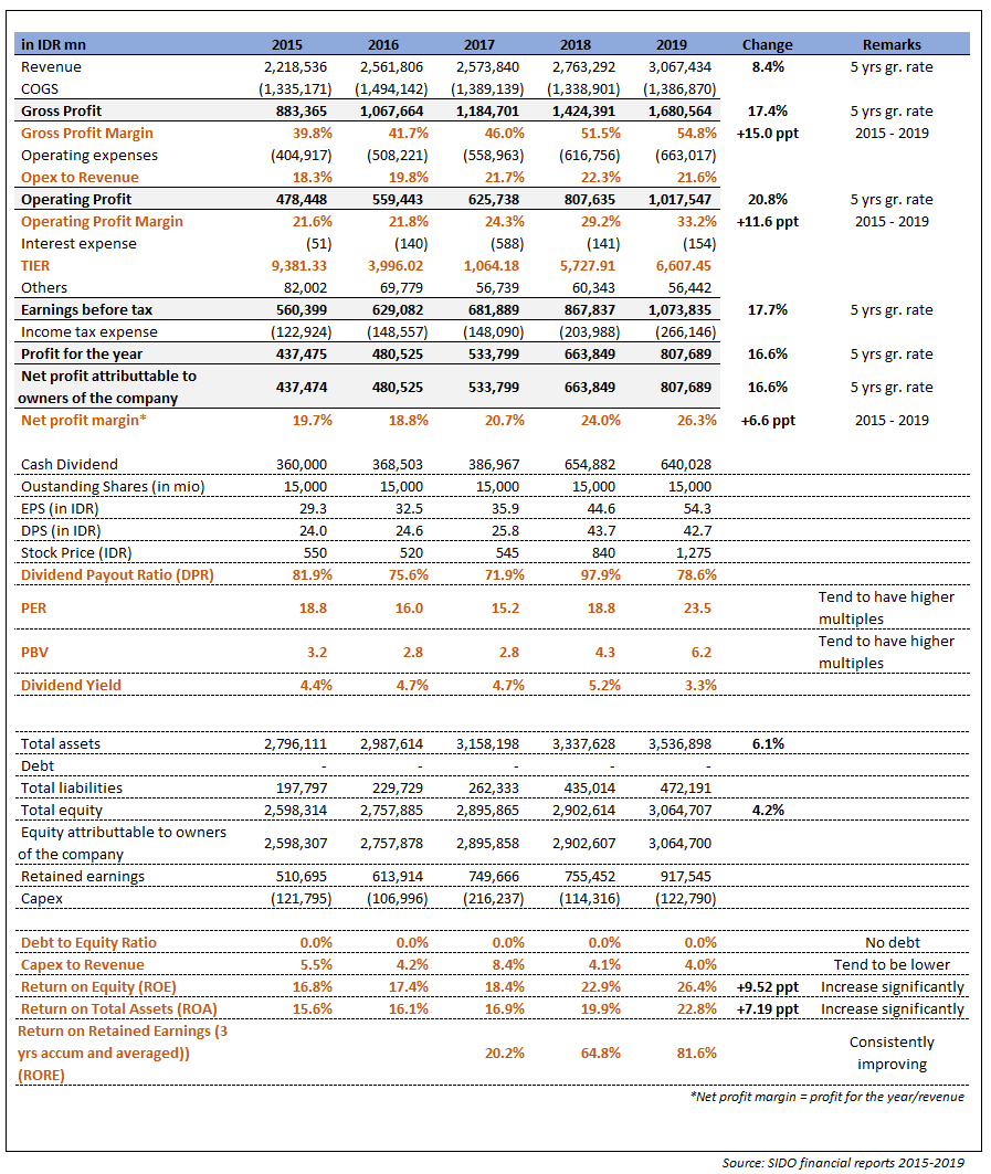 Terlihat bahwa pendapatan SIDO meningkat secara stabil selama 5 tahun terakhir, meskipun pertumbuhannya tidak terlalu tinggi. Yang menarik adalah kemampuan mereka dalam memperbaiki Margin Laba Kotor secara konsisten sehingga pertumbuhan Laba Kotor mencapai 17,4%. Sementara itu, biaya operasional (OPEX) hanya meningkat 13,1% per tahun sehingga pertumbuhan laba operasional mencapai 20,8%. Beban bunga SIDO sangat rendah yang membuat Rasio Times Interest Earned (TIER) sangat tinggi dan ini merupakan hal yang positif. Di bagian akhir laporan keuangan, laba bersih terus meningkat dengan laju pertumbuhan 16,6% selama 5 tahun terakhir.