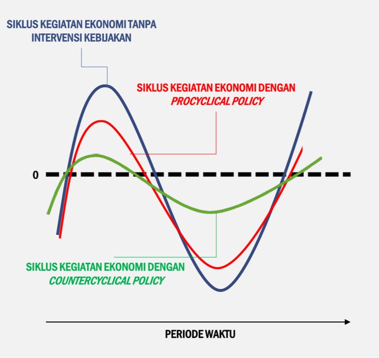 Seperti yang terlihat dalam grafik di atas, suatau kegiatan ekonomi tanpa intervensi pemerintah bisa melaju sangat tinggi kemudian mengalami titik balik dengan kontraksi yang sangat dalam. Jika BI melaksanakan kebijakan moneter procyclical maka laju pertumbuhan bisa lebih stabil saat seharusnya melaju tinggi, dan tidak terlalu dalam kontraksinya saat seharusnya alami kontraksi. Sedangkan jika BI melaksanakan kebijakan moneter countercyclical BI benar-benar menahan laju pertumbuhan yang tinggi dan menahan agar ekonomi tidak turun tajam.