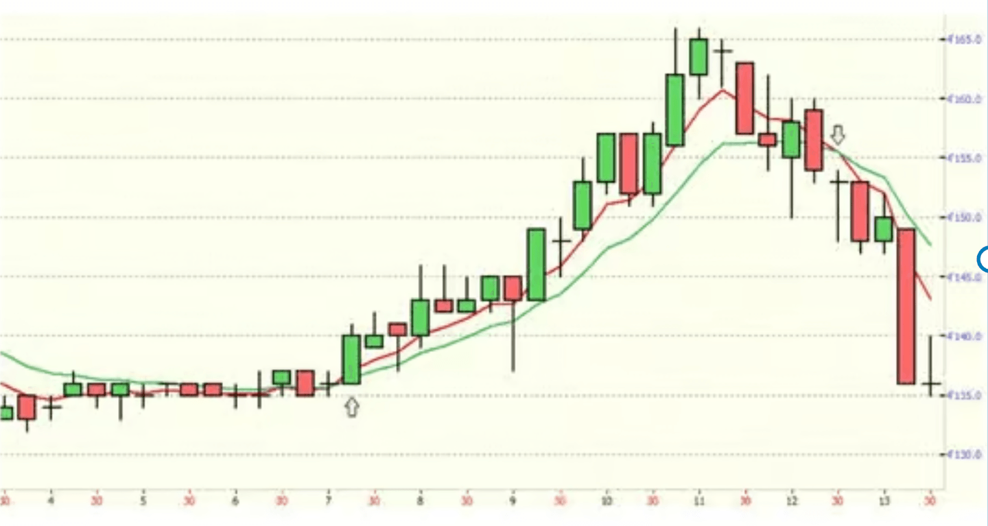 Sinyal keluar akan dipicu oleh persilangan sebaliknya, ketika garis merah memotong di bawah garis hijau, seperti yang ditunjukkan oleh panah yang mengarah ke bawah lima jam setelah masuk. Langkah untuk keluar perdagangan akan terjadi pada level penutupan pada 4,153 poin dengan biaya komisi sebesar £5 (US$ 5,43).