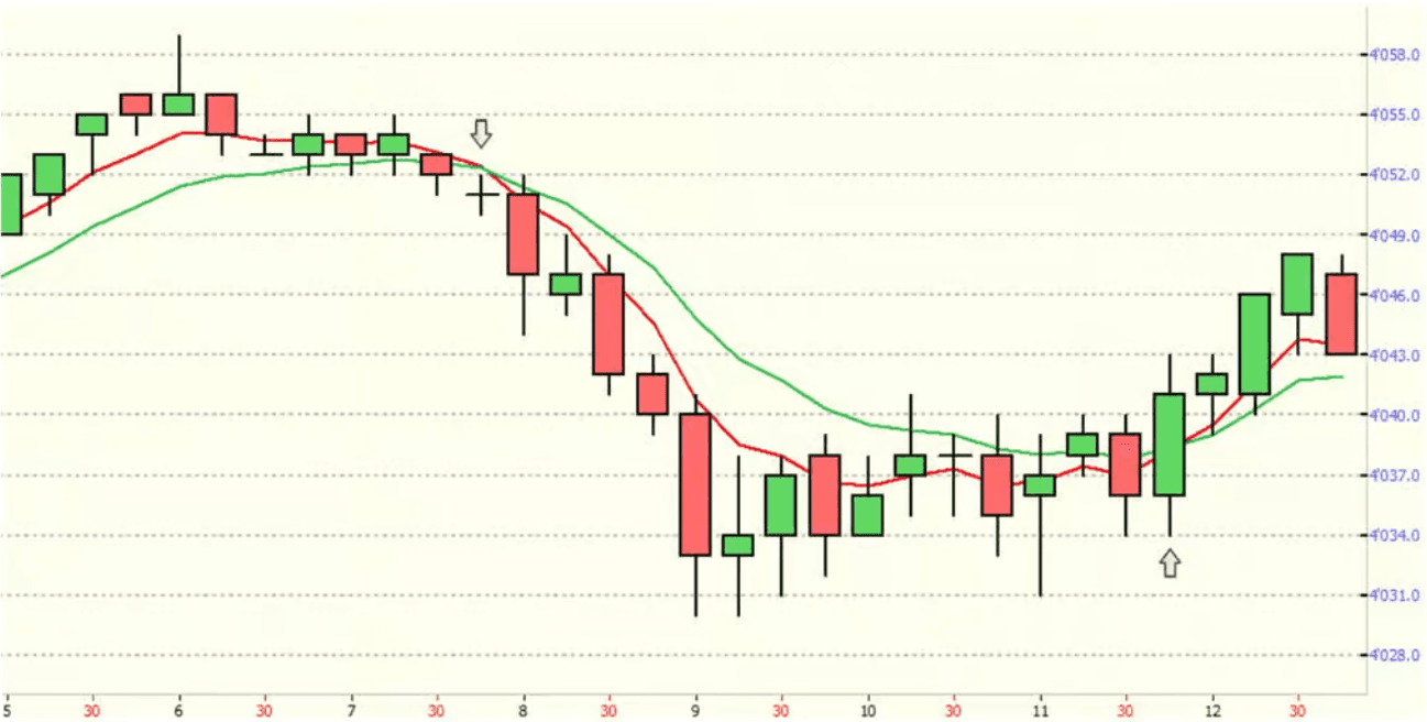 Dalam contoh ini, kita akan masuk ke dalam perdagangan ketika garis merah melintasi garis hijau, yang ditandai dengan panah yang mengarah ke atas. Entrinya akan berada pada level penutupan candle 15 menit, pada harga 4,140 poin.