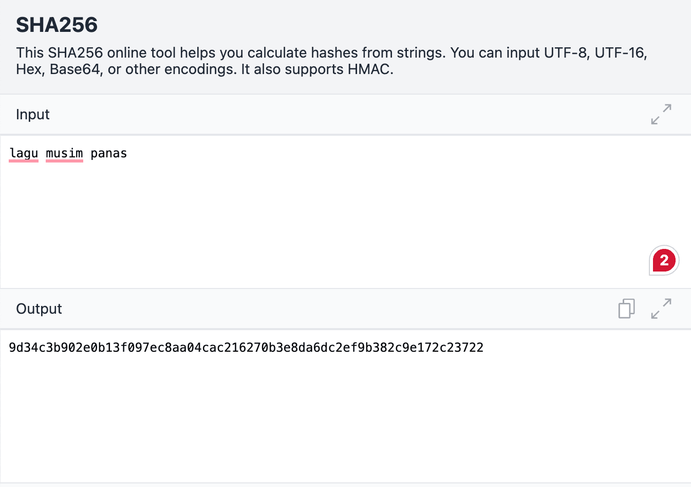 Harus Anda ketahui bahwa algoritma SHA-256 ini mengubah rantai dengan panjang berapa pun menjadi rantai dengan panjang yang tetap, yaitu 64 karakter.