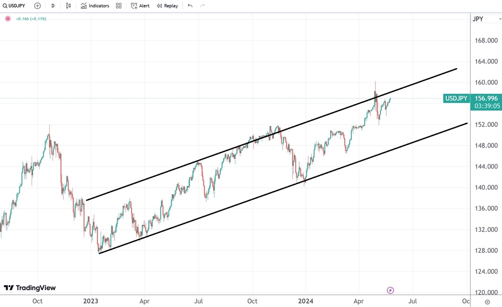 Mari melihat kembali grafik di atas. Selama tren naik, penetapan suku bunga oleh Reserve Federal Amerika Serikat selalu lebih tinggi daripada penentapan suku bunga oleh Bank Jepang. Saat penulisan ini, suku bunga di Amerika Serikat sebesar 5,25% sedangkan di Jepang sebesar 0,1%. Oleh karena itu, swap positif ini memberikan trader bunga selain hasil dari perbedaan harga.