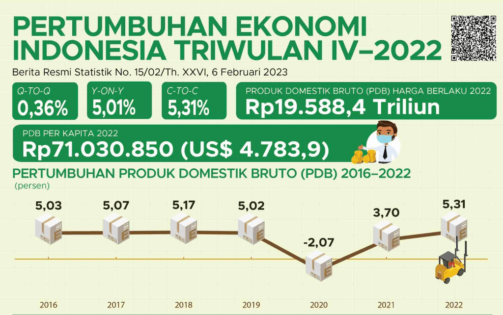 Pada tahun 2022, pertumbuhan ekonomi Indonesia berhasil tumbuh 5,31%. Menjadi pertumbuhan yang paling tinggi sejak 2016.