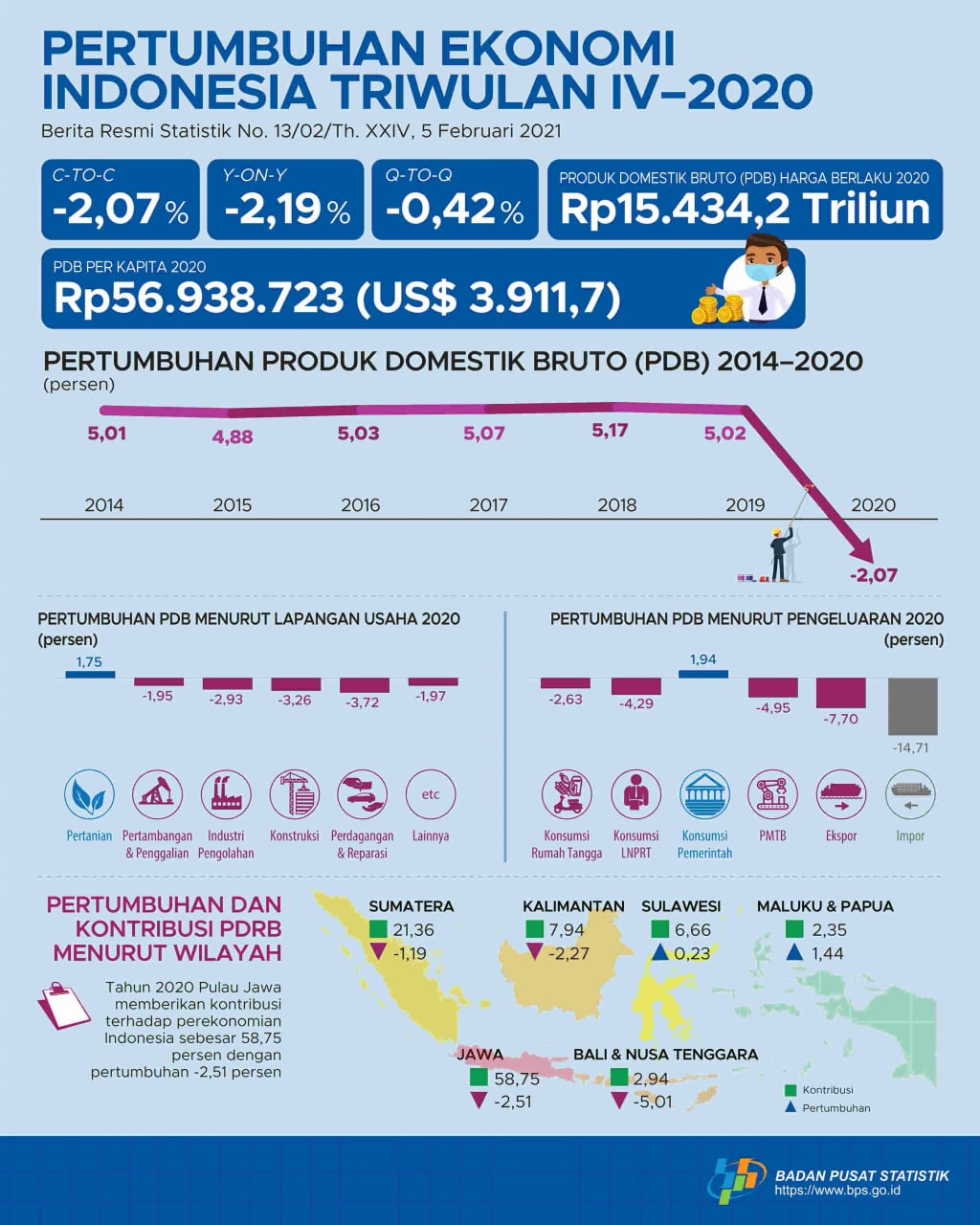 Pertumbuhan ekonomi Indonesia pada tahun 2020 mengalami penurunan -2,07%. Ini menjadi yang terendah sejak 2014. Hal ini disebabkan seluruh sektor mengalami penurunan kecuali pertanian. Dari sisi pengeluaran semua pos mengalami penurunan kecuali belanja pemerintah.