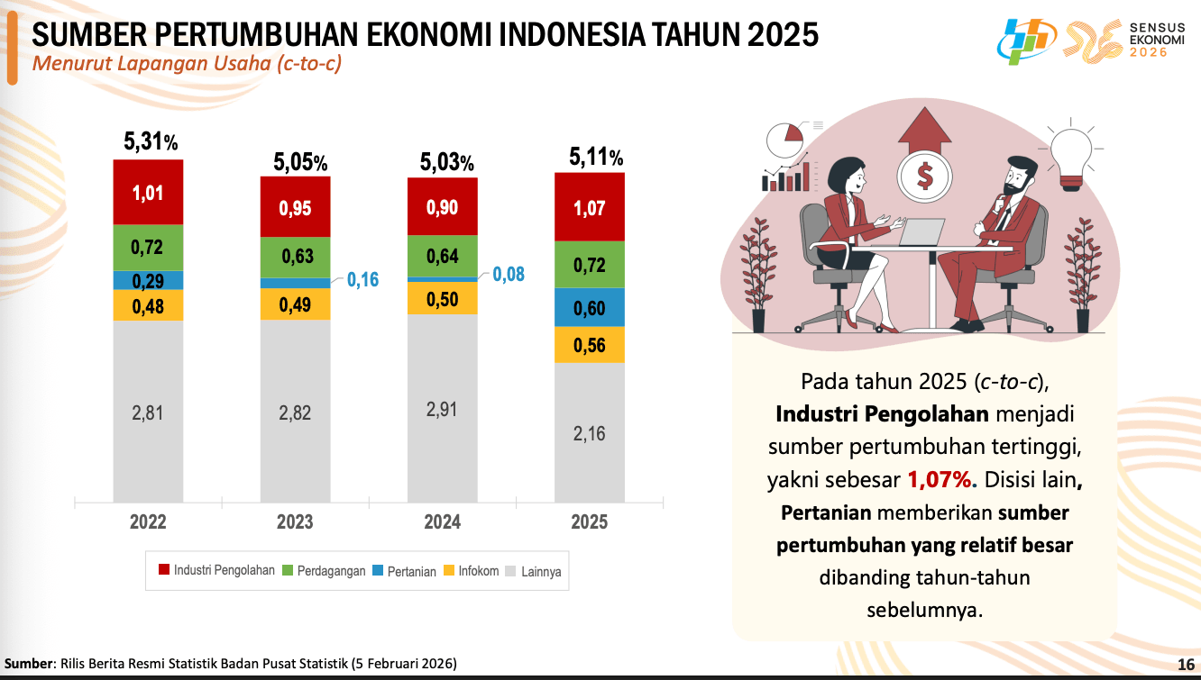 Pertumbuhan ekonomi Indonesia 2025 tercatat lebih tinggi dari tahun sebelumnya, namun cenderung stabil. Menurut data BPS pertumbuhan ekonomi Indonesia tahun 2025 tercatat tumbuh 5,11%. Pertumbuhan ekonomi ini didorong kondisi ekonomi yang lebih kuat pada kuartal IV-2025 yang tercatat tumbuh 5,39% sejalan dengan kondisi musiman libur akhir tahun.