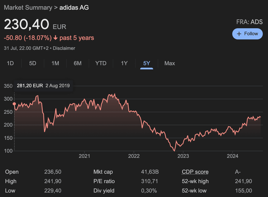 Adidas berdiri pada tahun 1949 dan sampai sekarang menjadi merek olahraga paling berharga kedua, setelah Nike. Perusahaan in terdaftar pada bursa dan memiliki perkembangan yang cukup baik. Tentunya saham perusahaan ini juga mengalami naik turun.