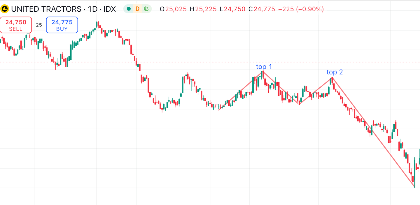 Misalnya, dalam grafik harga saham, Anda mungkin melihat harga naik ke titik tertinggi, kemudian turun sedikit, lalu naik lagi ke titik tertinggi yang sama atau mirip, dan akhirnya turun lebih jauh.