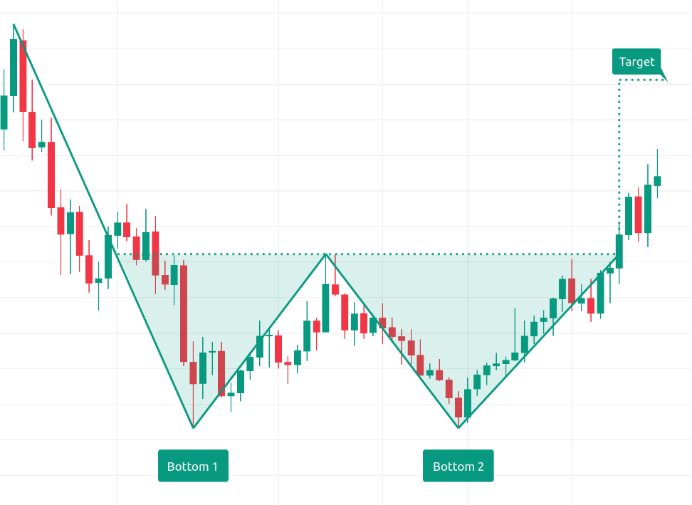 Untuk mengidentifikasi pola ini, pertama-tama cari dua titik rendah yang hampir sama pada grafik harga, dengan sebuah puncak kecil di antaranya. Pola ini terbentuk ketika harga jatuh ke titik rendah pertama, kemudian naik sedikit sebelum turun lagi ke titik rendah kedua yang sejajar atau hampir sejajar dengan yang pertama.