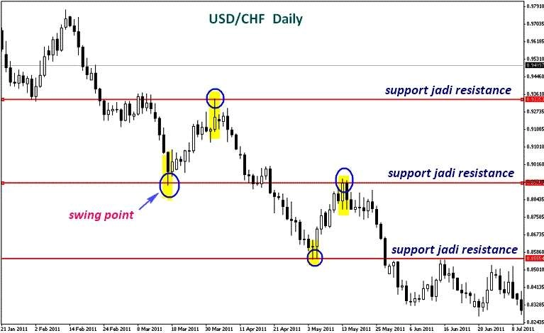 Seperti yang terlihat pada gambar di bawah ini, price action forex dalam pasangan USD/CHF sedang bergerak turun (downtrend) dengan level-level support dan resistance yang digambarkan dengan garis horizontal. Aturannya adalah jika level support ditembus, area tersebut akan menjadi resistance, dan begitu pula sebaliknya, resistance akan menjadi support.