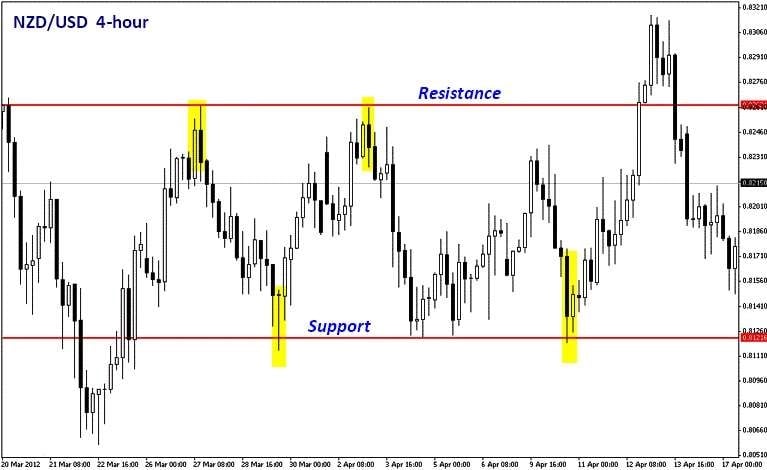 Pada contoh di bawah, keempat pin bar terjadi di level resistance dan support. Untuk kondisi pasar yang mendatar (ranging/sideway), kita cukup mengamati formasi bar yang terbentuk di resistance dan support. Jika terjadi break, pastikan itu bukan false break. Mengapa formasi pin bar penting di sini? Trader forex seringkali salah sangka bahwa semua pin bar terbentuk karena alasan yang sama, padahal banyak faktor lain yang mempengaruhi selain ukuran, karakteristik, perbedaan dengan pin bar sebelumnya, serta faktor teknis lainnya.