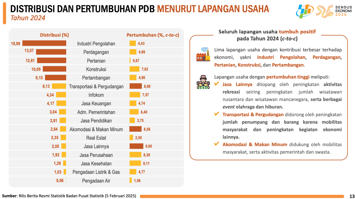 Produk Domestik Bruto Indonesia jika dilihat dari lapangan usaha, paling besar ditopang oleh: