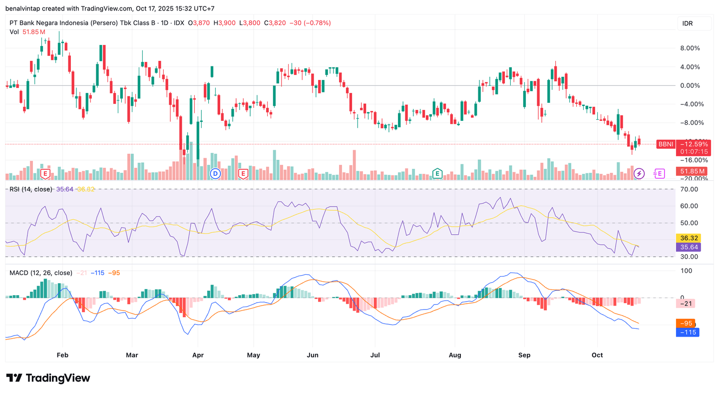 Selain itu, harga saham BBNI saat ini juga berada di bawah kedua garis MA yang artinya tekanan jual masih besar. Selain itu investor besar juga belum terlihat masuk secara agresif. Dengan jarak MA 50 dan MA 200 yang lebar ini menunjukkan momentum penurunan yang masih berlanjut. Namun mulai melambat sejak Oktober 2025 ini.