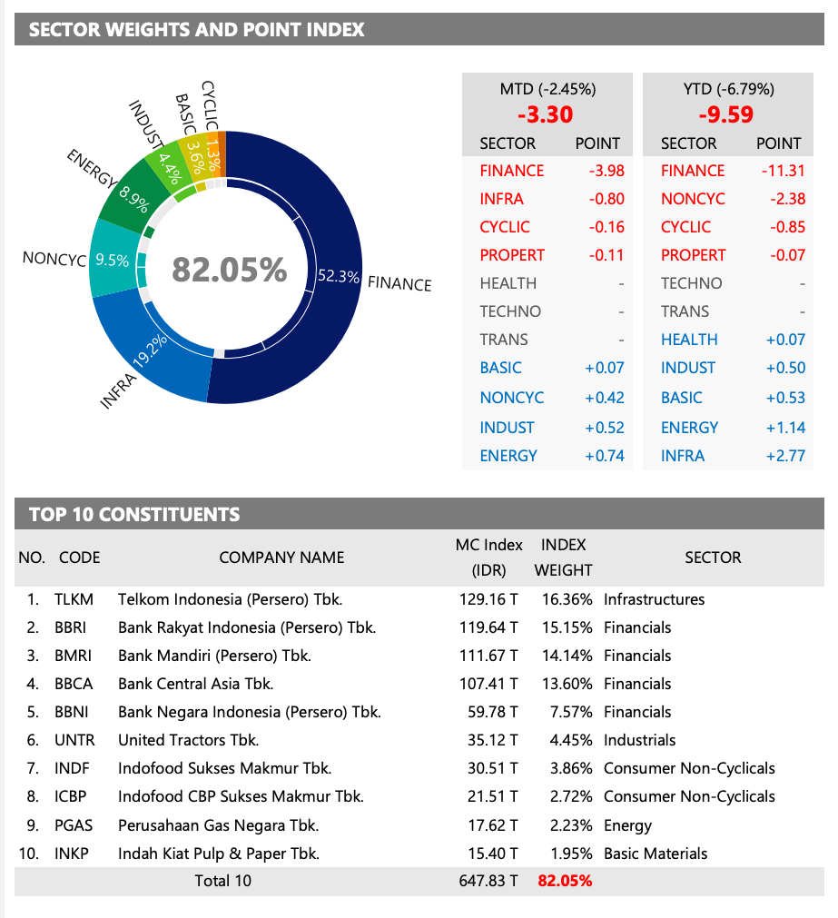 Sektor di indeks ini masih didominasi oleh sektor keuangan, dengan persentase 54,5%. Beberapa saham sektor keuangan dengan bobot tinggi pada indeks tersebut yaitu BBRI (15,15%), BMRI (14,14%), dan BBCA (13,6%). Adapun porsi terbesar saat ini di saham TLKM dengan bobot 16,36%.