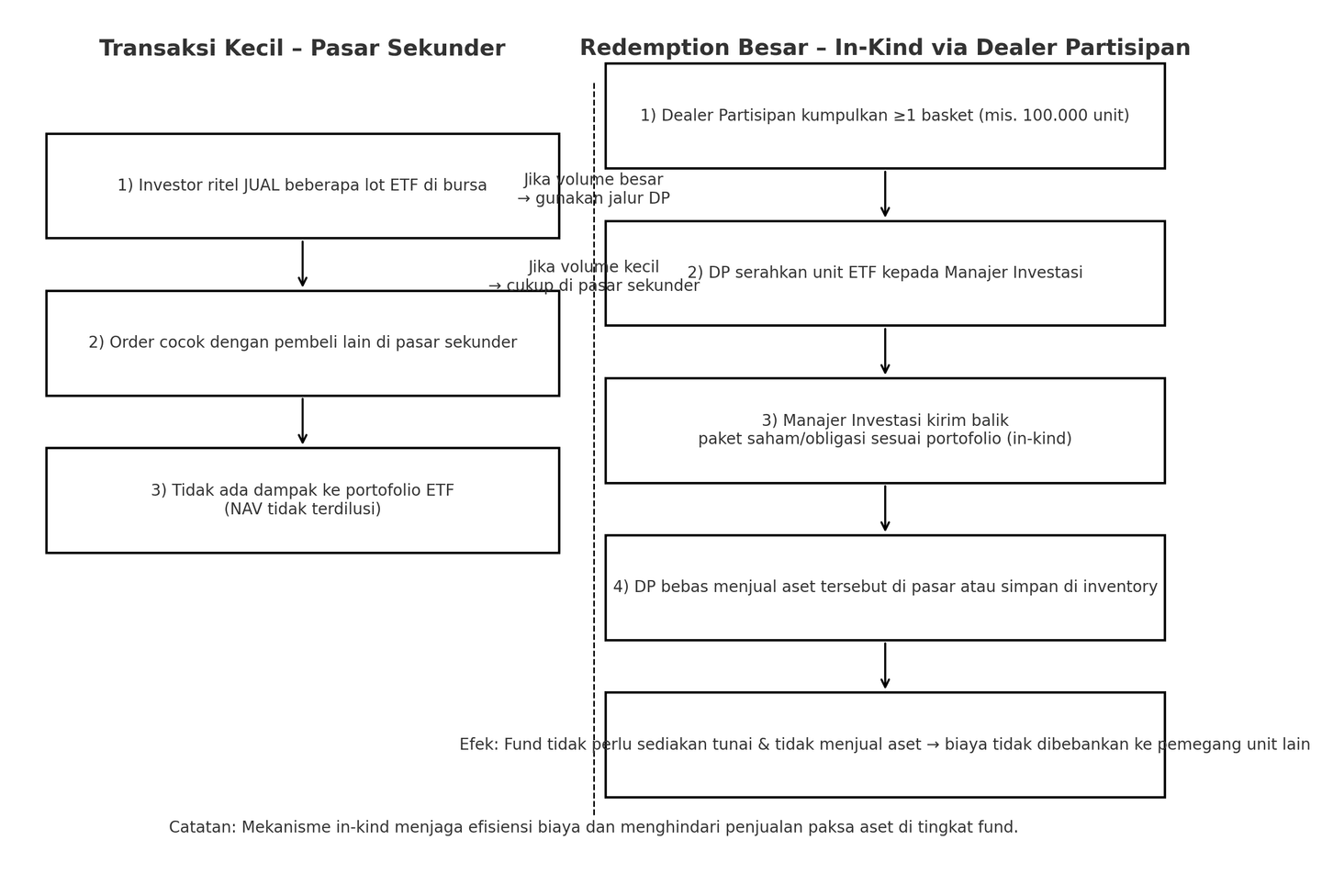 Jika investor ritel ingin menjual unit ETFnya, bisa dilakukan di bursa seperti jual saham pada umumnya. Bahkan penjualan dengan jumlah kecil bisa melalui pasar sekunder yang transaksinya cukup antar investor saja. Jadi tidak berdampak ke seluruh investor yang memiliki unit di ETF tersebut.