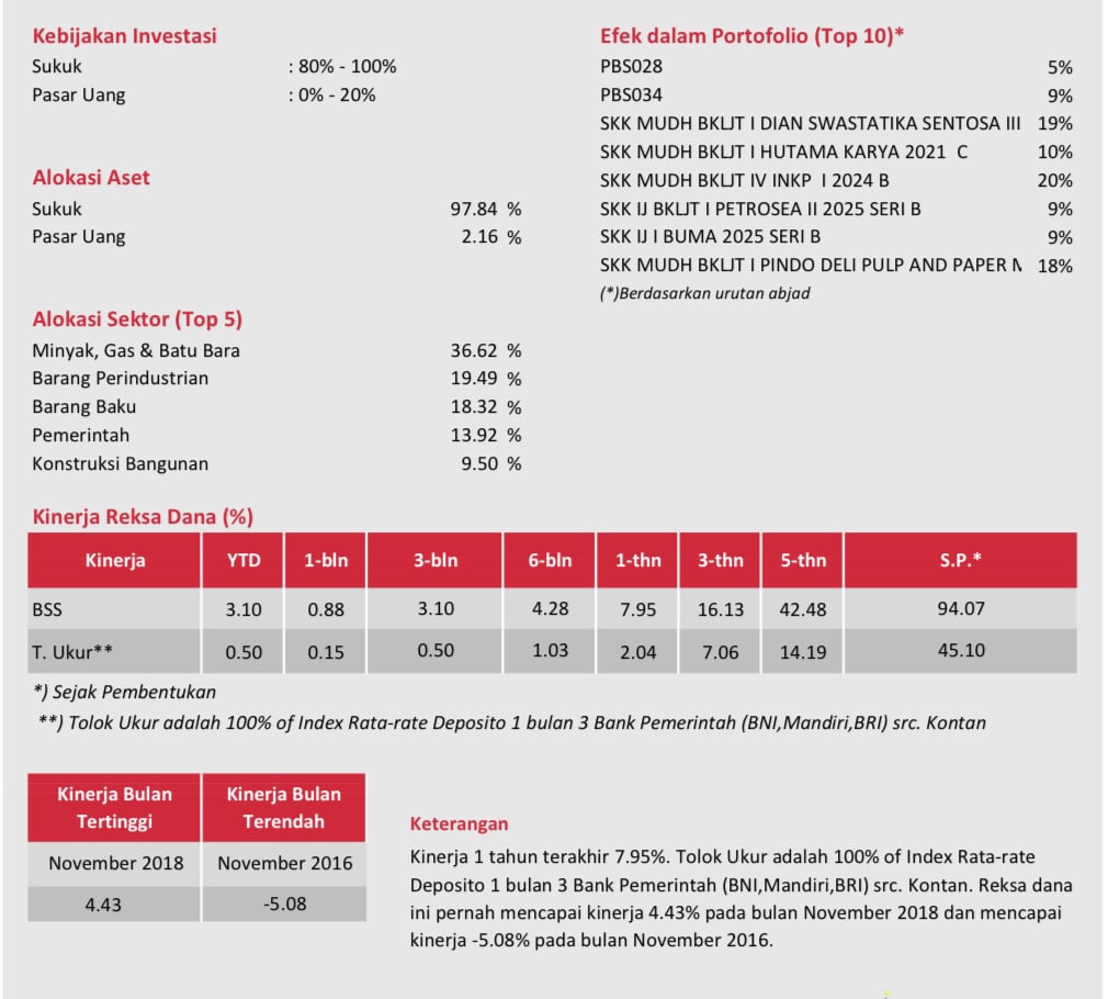 Adapun kinerja dari reksa dana pendapatan tetap Bahana Sukuk Syariah per 29 Juli 2025: