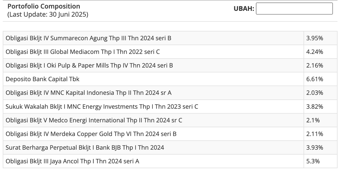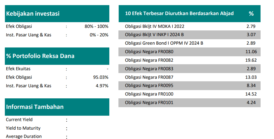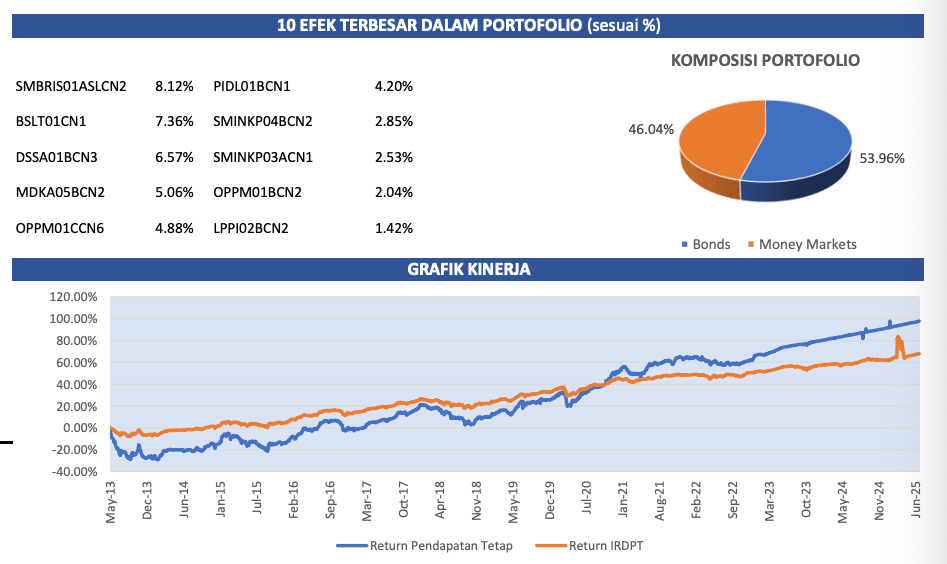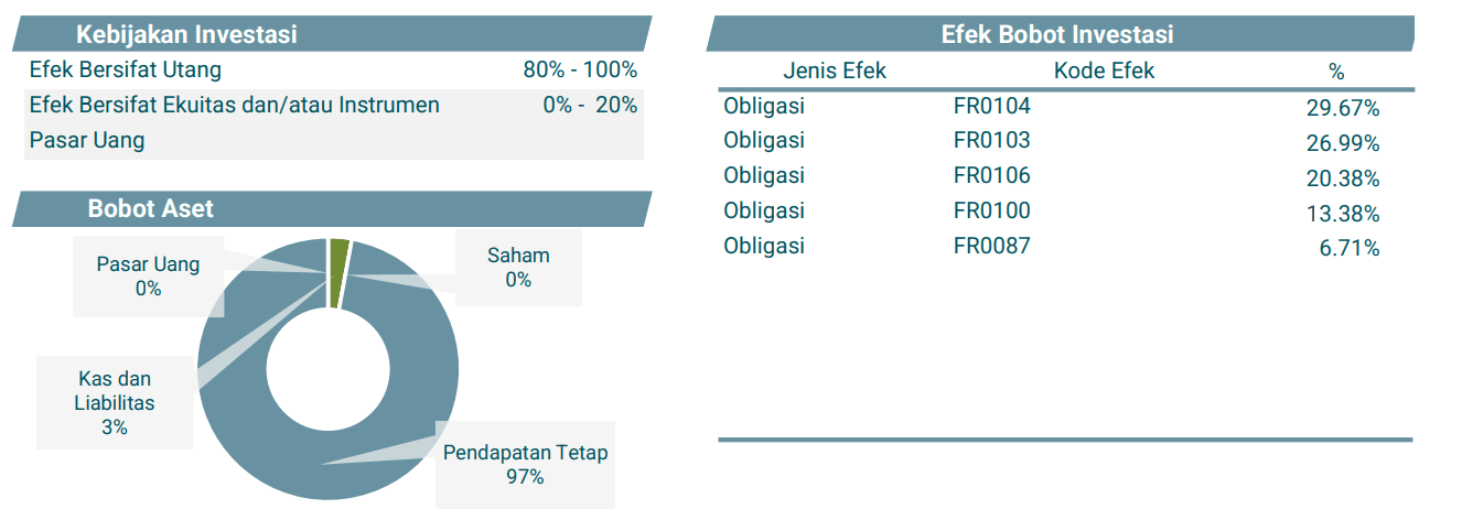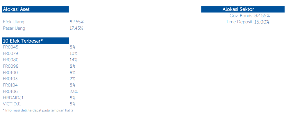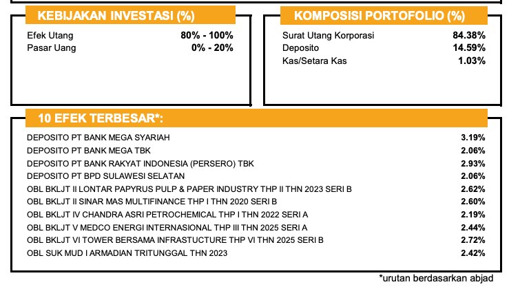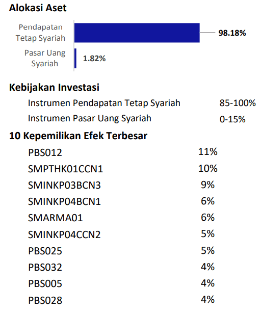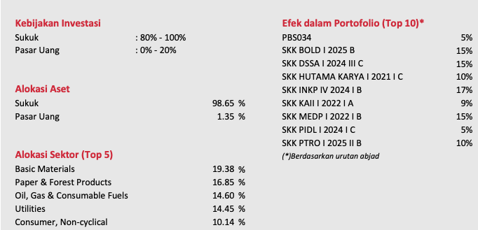 RDPT Terbaik 2025 kita lihat dari historisnya ini memiliki tujuan investasi memberikan tingkat pengembalian optimal dalam jangka menengah. Saat ini dana kelolaan sebesar Rp 21,2 miliar diinvestasikan di sukuk terutama pada sektor bahan baku (19,38%).