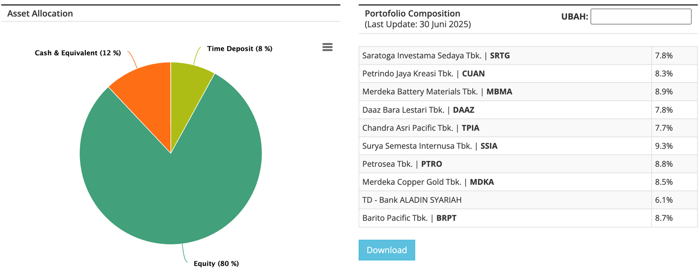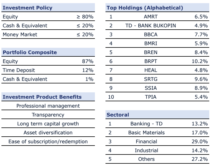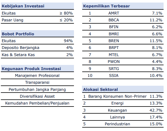 Oleh karena itu, produk ini cocok untuk investor dengan profil risiko tinggi dan berfokus pada saham domestik dengan potensi imbal hasil optimal. Beberapa saham yang mereka koleksi per Juni 2025, yaitu: BBCA, BBRI, TLKM, PTRO, dan INDY.