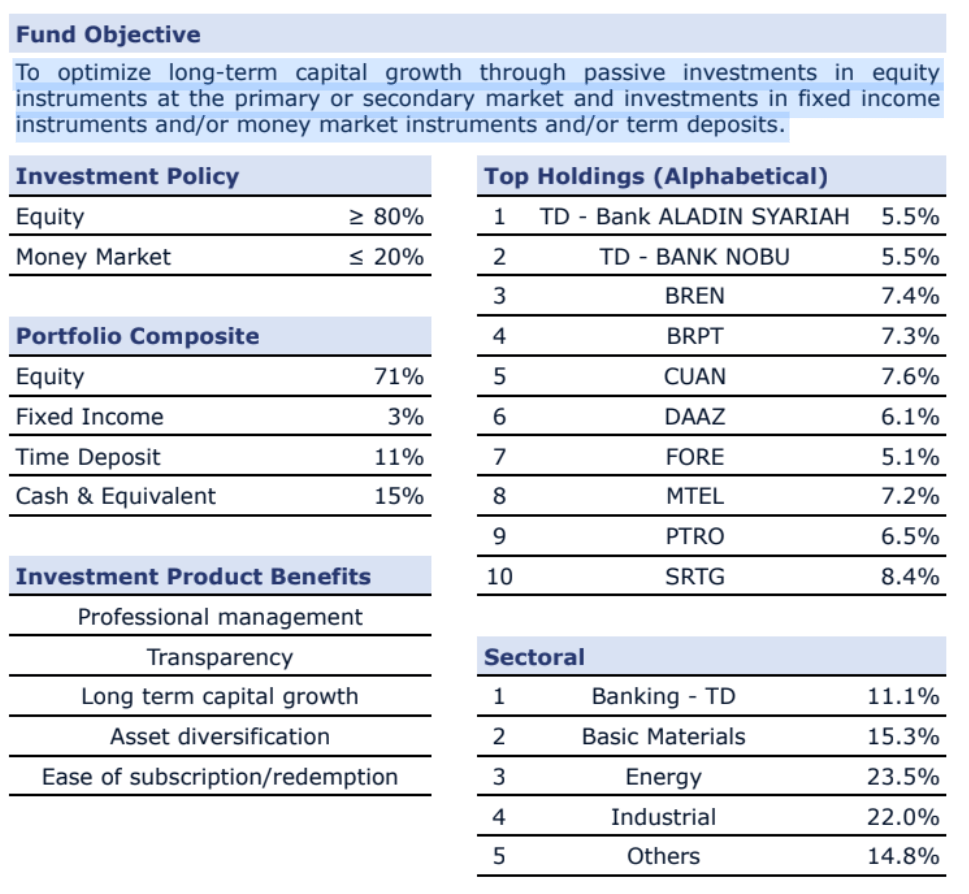 Oleh karen itu, produk ini cock bagi investor moderat hingga agresif yang mencari potensi pertumbuhan jangka panjang melalui saham syariah yang berorientasi pada sektor strategis domestil. Beberapa saham yang mereka koleksi per Juni 2025, yaitu: PANI, DEWA, TLKM, AMMN, dan BUMI.