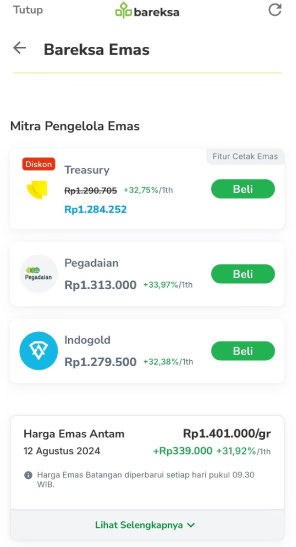 Bareksa adalah fitur transaksi emas fisik secara online dengan fasilitas penitipan yang terdapat pada aplikasi. Platform ini menyediakan informasi harga emas dari waktu ke waktu sehingga Anda dapat melihat perkembangannya. Selain itu, Anda juga tidak perlu repot-repot menyimpan dan mengamankan emas fisik.