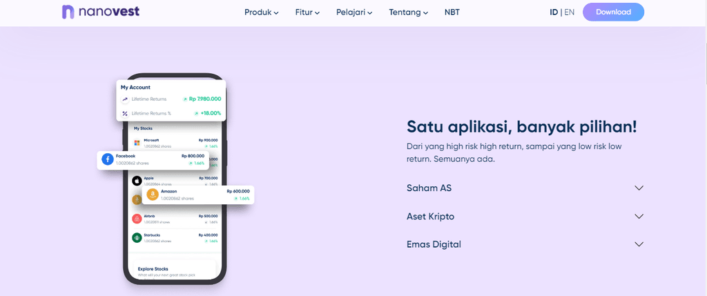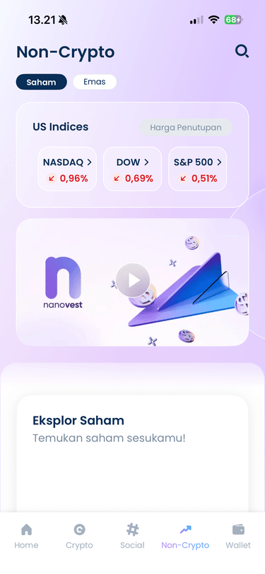 Aplikasi Nanovest adalah aplikasi investasi yang menawarkan multi aset bagi pengguna. Investor bisa dengan mudah melakukan diversifikasi portofolio investasi dengan berinvestasi di beberapa aset investasi sekaligus (aset crypto, emas digital, dan saham Amerika Serikat).