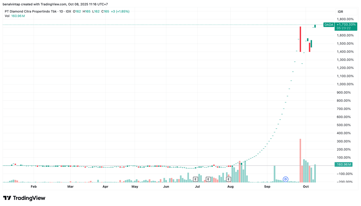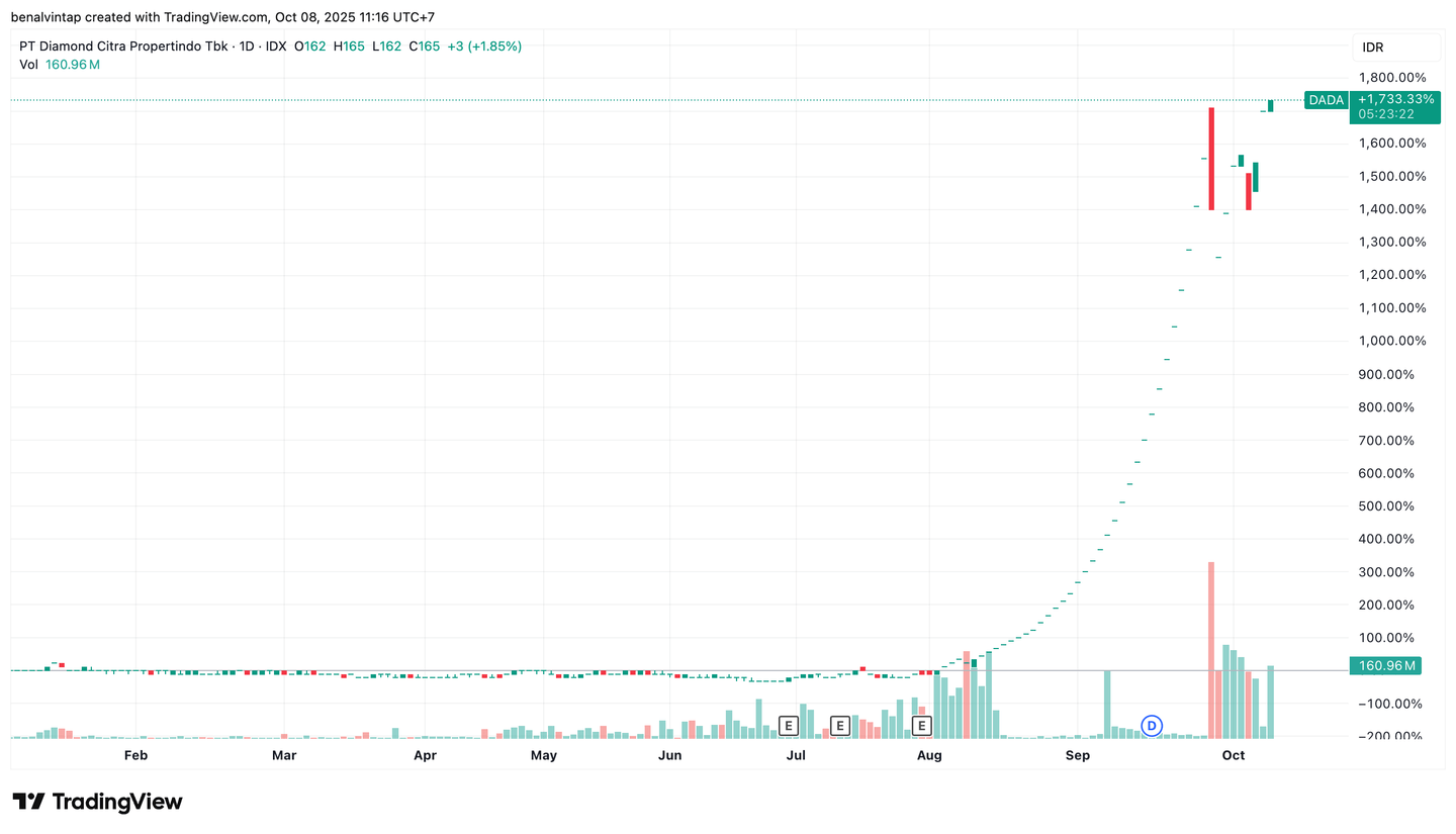 Harga saham DADA melesat naik hingga 1.900% sejak awal tahun 2025 hingga per 8 Oktober 2025. Saham yang berada di papan pemantauan khusus (FCA Saham) ini rumornya bakal memiliki dua investor baru yaitu Kajima Corporation dan Mitsubishi Estate melalui skema backdoor listing.
