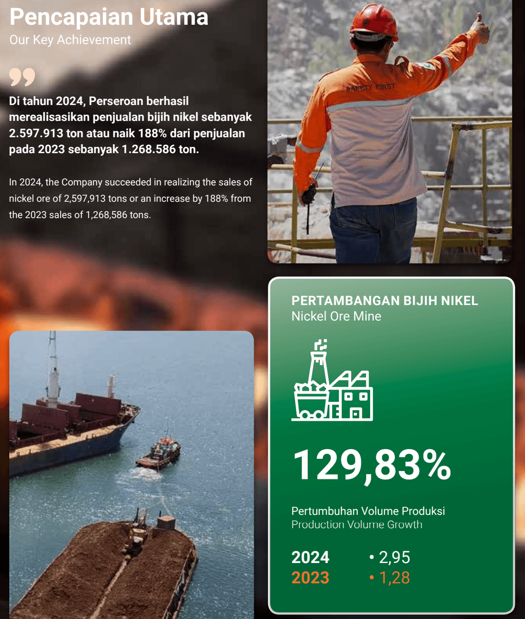 Dari tabel di atas kita dapat melihat peningkatan signifikan dari produksi bijih nikel sebesar 129,83% YoY. Peningkatan ini mencerminkan perluasan kapasitas produksi dan efisiensi operasional yang terjadi di lapangan. Kemudian, penjualan bijih nikel juga mengalami peningkatan signifikan karena berhasil menjual 2,59 juta ton (naik 188% YoY).