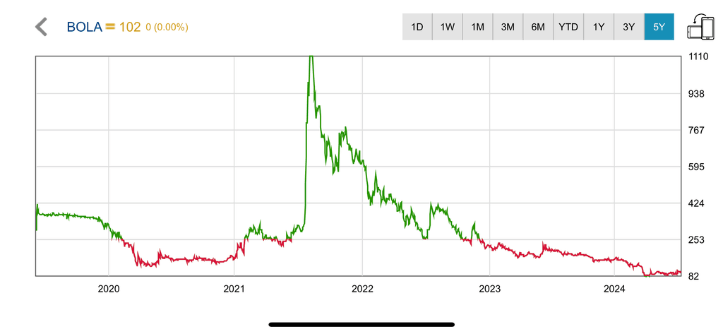 PT Bali Bintang Sejahtera Tbk adalah perusahaan yang menaungi Bali United. Perusahaan ini sahamnya terdaftar di BEI pada 17 Juni 2019 dengan harga awal Rp 170 per lembar. Begini grafik kinerja saham BOLA dalam 5 tahun: