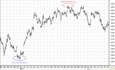 Gambar di atas adalah chart Ibex-35 dalam grafik batang 30 menit, di mana perubahan tren yang terjadi pada 2 Januari 2003, hari bulan purnama, terlihat jelas.