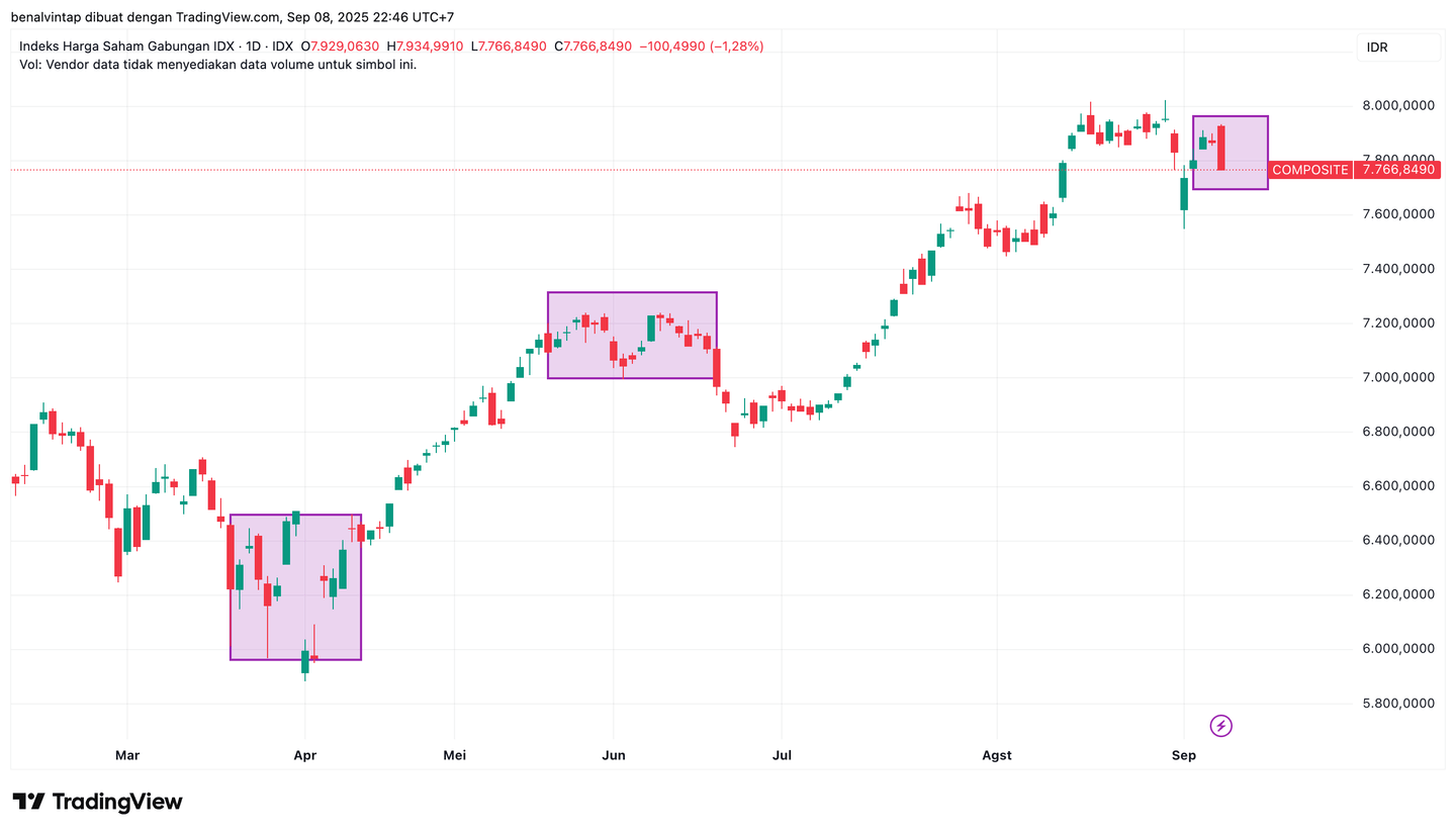 Bertepatan dengan pengumuman resmi reshuffle kabinet Prabowo Merah Putih, IHSG anjlok 1,28% pada penutupan pasar Senin, 8 September 2025. Meski anjlok pada penutupan hari ini, IHSG tercatat masih menguat 8,43% sejak awal tahun.