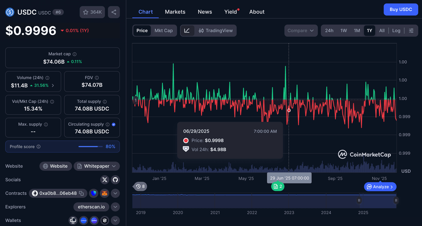 Nilai satu USDC adalah seharusnya tepat sama dengan nilai satu dolar AS (USD). Namun dalam praktiknya, biasanya bergerak beberapa ribu perak (thousandths). Oleh karena itu nilainya bisa berubah sesaat menjadi misalnya US$ 0,9999 atau US$ 1,0001.