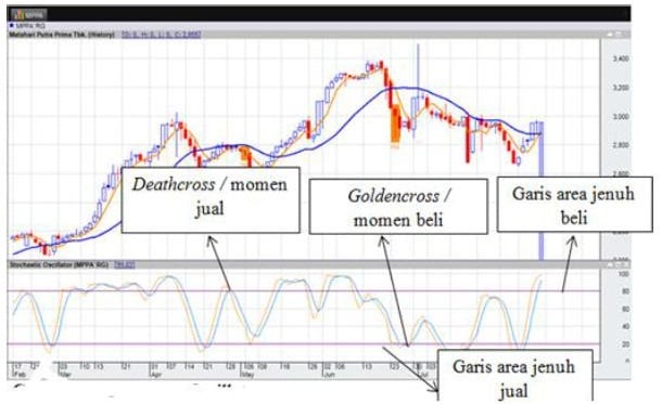 Kita dapat mengikuti strategi berikut ini dengan indikator stokastik, yaitu dengan mengamati persilangan garis: