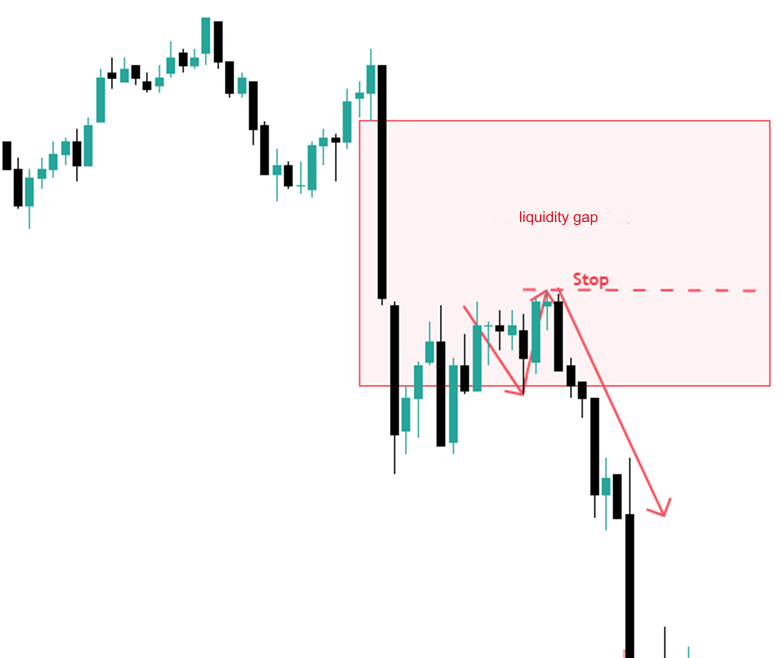 Dalam situasi di mana terjadi kekosongan likuiditas dan perubahan struktur pasar, tindakan yang kami ambil adalah menempatkan posisi pada level resistensi atau support. Misalnya, jika terjadi gerakan harga yang kuat ke arah bearish yang meninggalkan kekosongan likuiditas, saya akan menempatkan order pada level resistance untuk mengantisipasi perubahan struktur dari pasar bullish menjadi bearish. Saya akan menempatkan stop loss di area di mana harga ditolak sehingga bisa memberikan perlindungan dalam kondisi pasar yang volatil.