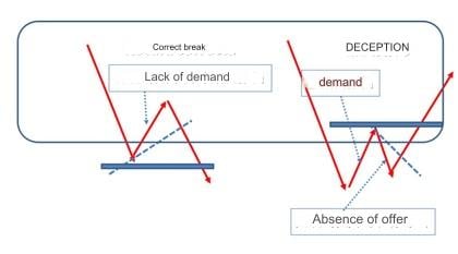 Dalam kasus penembusan yang benar, harga akan kembali naik tanpa peningkatan volume, yang berarti tidak ada permintaan tambahan. Sebaliknya, dalam kasus penembusan palsu, harga kembali naik dengan peningkatan volume, menunjukkan adanya permintaan. Setelah itu, biasanya terjadi sedikit penarikan harga dan jika penarikan tersebut terjadi tanpa peningkatan volume, kita sudah bisa masuk ke pasar karena penembusan tersebut hanyalah upaya untuk mengambil likuiditas.