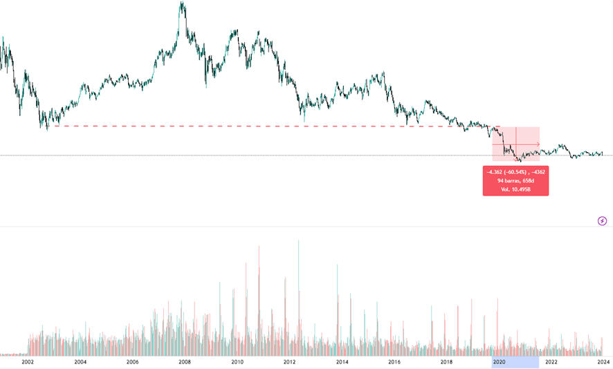 Pada grafik di bawah, terlihat ada level support yang menahan harga selama 17 tahun. Namun, pada akhirnya, level support itu tertembus dan harga mulai turun. Perhatikan kecepatan penurunan harga yang cukup drastis, di mana dalam waktu sedikit lebih dari satu tahun, harga turun lebih dari 60%.