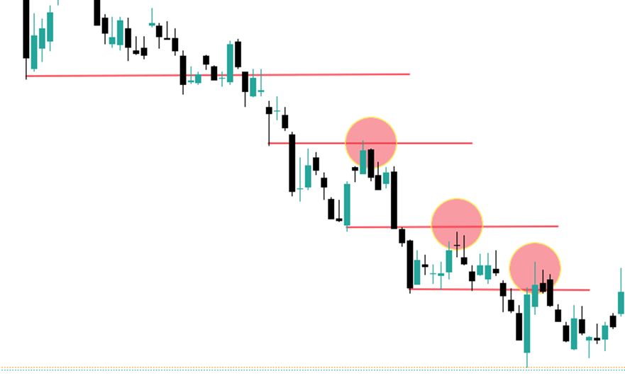 Dalam contoh ini, kita dapat melihat bagaimana harga aset yang turun membentuk titik support yang akhirnya dilampaui. Pada kasus pertama, harga tidak pernah kembali ke titik support (yang sekarang berubah menjadi level resistance), tetapi pada kasus lainnya, hal tersebut terjadi. Jika diamati, ketika harga mencapai kembali level resistance yang dulunya adalah support, biasanya harga akan ditolak kembali turun.