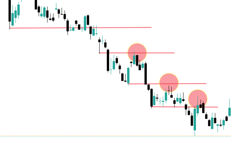 Gambar di atas menunjukkan bahwa harga yang menyentuh resistance mengalami kesulitan untuk terus naik sehingga harga tetap berada di bawah level resistance karena tidak bisa menembusnya. Hal ini terjadi karena aksi profit taking oleh trader yang meningkatkan tekanan jual.