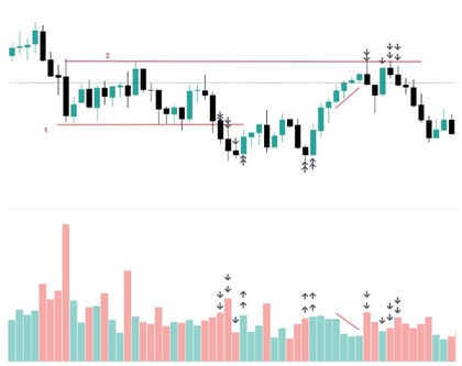 Apa yang terjadi ketika harga menyentuh level support? Pada awalnya, muncul dua candlestick bearish (panah ganda turun), diikuti oleh candlestick bearish dengan volume sangat rendah, menunjukkan bahwa harga tidak tertarik untuk turun lebih jauh. Segera setelah itu, muncul candlestick bullish (panah ganda naik), ini adalah tanda penembusan palsu. Harga kemudian kembali turun ke zona yang sama dan lagi-lagi muncul candlestick bullish.
