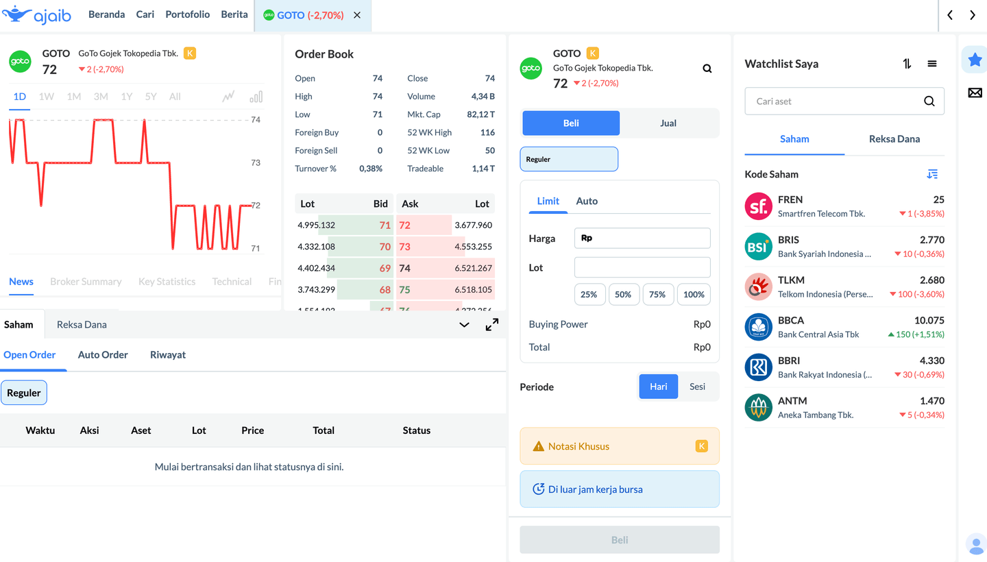 ✅ Fee transaksi jual beli saham yang kompetitif | ❌ Data trading tidak real-time | ||