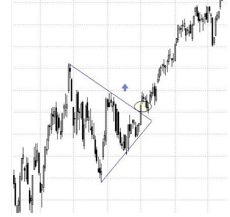 Jika tren pasar sedang naik (bullish), kita harus menunggu untuk melihat apakah harga, setelah bergerak dalam rentang dua garis pedoman yang membentuk segitiga, menembus bagian atas. Dalam kasus tersebut, itu akan memberikan sinyal beli dan melanjutkan momentum naik.