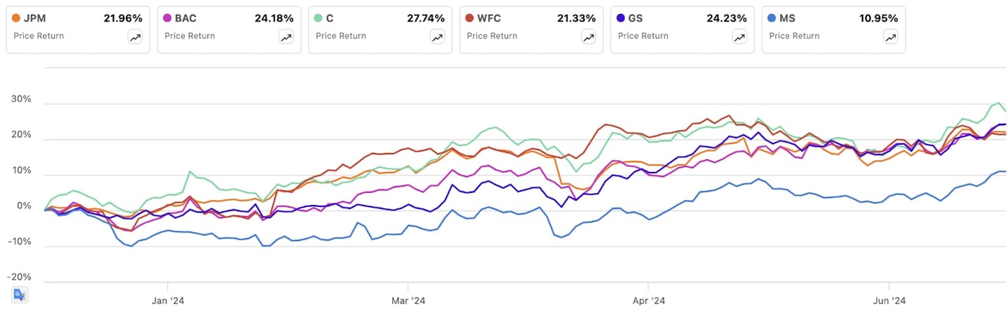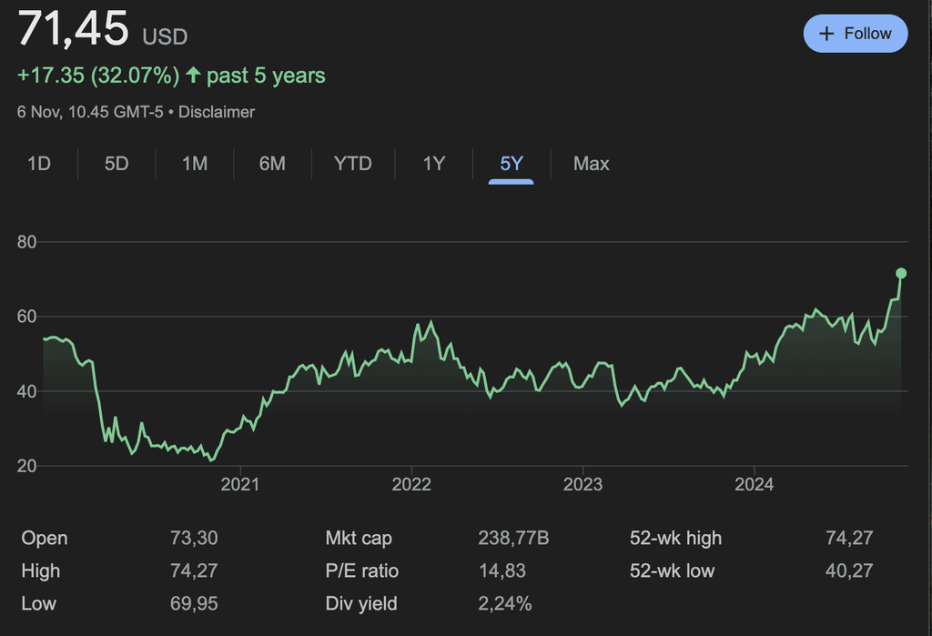 Selain menempati peringkat kelima terbaik di sektor keuangan, Wells Fargo adalah salah satu bank terbaik dalam hal mendiversifikasi asetnya. Dengan peningkatan hampir 30% sepajang tahun 2024, analis UBS memperkirakan bahwa bank-bank besar seperti Wells Fargo mendapatkan keuntungan dari regulasi permodalan dan likuiditas yang tidak terlalu ketat di bawah kepemimpinan Trump.
