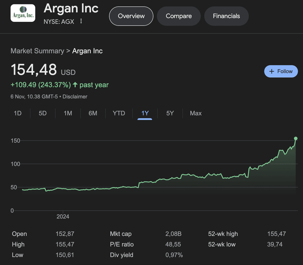 Pada kuartal ketiga tahun fiskal 2024, AGX melampaui ekspektasi, dengan EPS sebesar $0,58 (melampaui $0,06) dan pendapatan sebesar $157,68 juta (melampaui $22,93 juta). EPS Argan diperkirakan tumbuh 64% pada tahun 2025 , mencapai $3,92 , dan pendapatan diperkirakan meningkat 35% , mencapai $778,65 juta .