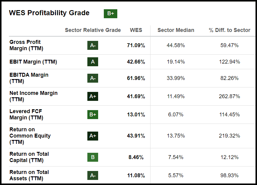Tidak hanya itu, tren pertumbuhan ini diperkirakan akan berlanjut, sejalan dengan proyeksi para produsennya. Dengan margin EBIT TTM sebesar 42% dan EBITDA sebesar 61%, WES jauh melampaui rata-rata sektor energi. Selain itu, perusahaan ini telah membukukan margin pendapatan bersih sebesar 41% daripada rata-rata 11% di sektor ini dan menunjukkan margin arus kas bebas (FCF) sebesar 13% dan ROE sebesar 43%.