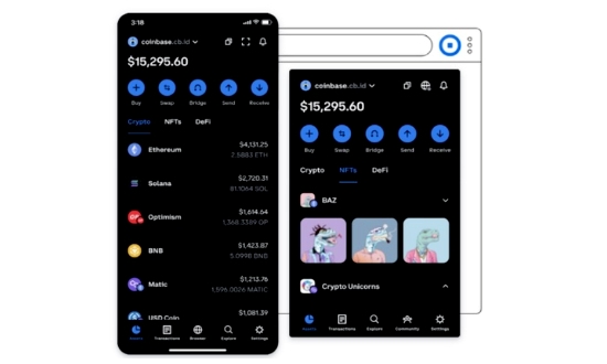 Ini adalah tampilan Coinbase Wallet, di bagian penyimpanan kripto dan NFTs yang menawarkan antarmuka modern dan menarik, serta kemudahan navigasi.