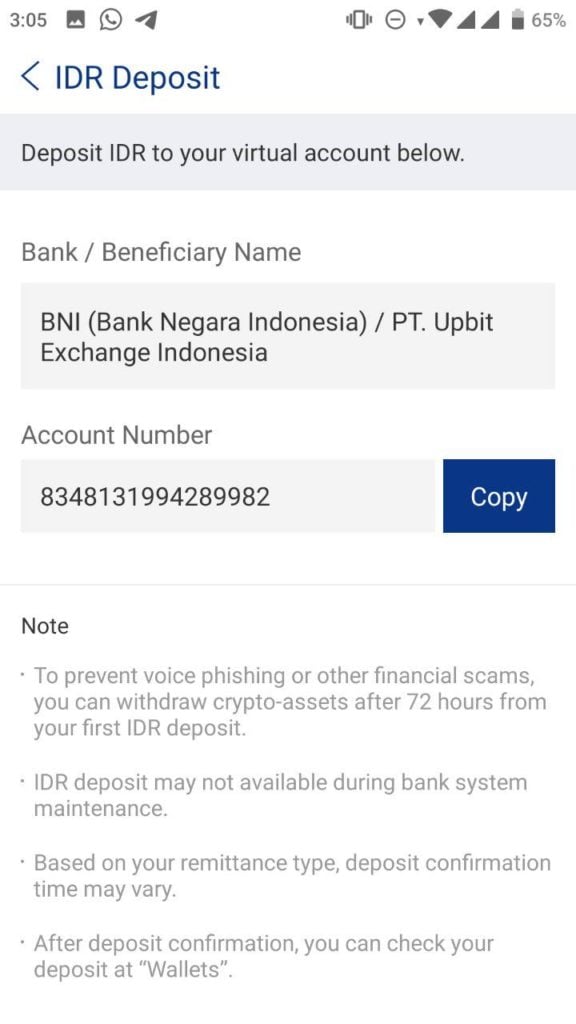 Berikut merupakan cara untuk melakukan deposti di akun Upbit Indonesia dengan mata uang Rupiah: